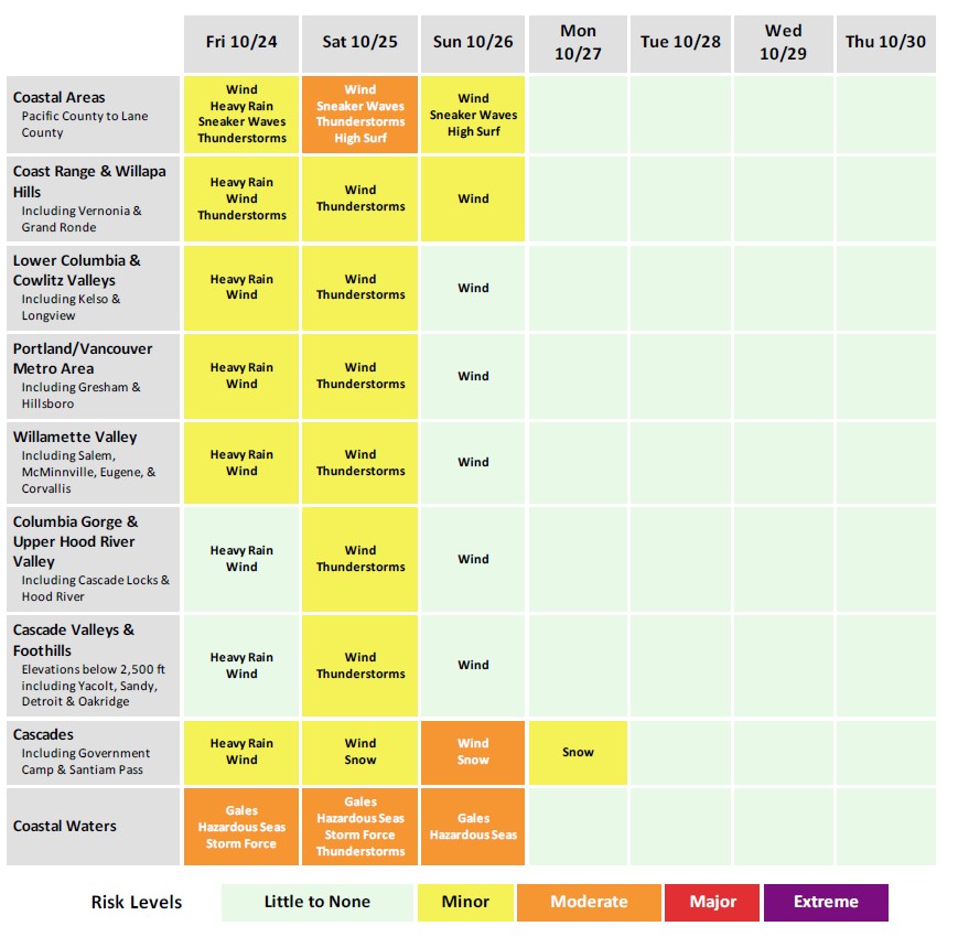 • A moderate atmospheric river and quick-following low pressure system brings multiple rounds of widespread rain and chances for high winds across northwest Oregon, southwest Washington, and the coastal waters Oct. 23-26.