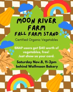 -Moon River Farm – Fall Farm Stand – $40/ FREE veggies for SNAP recipients; Saturday 11/8 @Wolfmoon Bakery in Nehalem