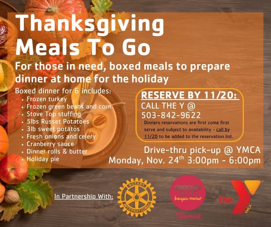 -Thanksgiving Meals To Go – partnership with Tillamook YMCA, Tillamook Rotary & Grocery Outlet
