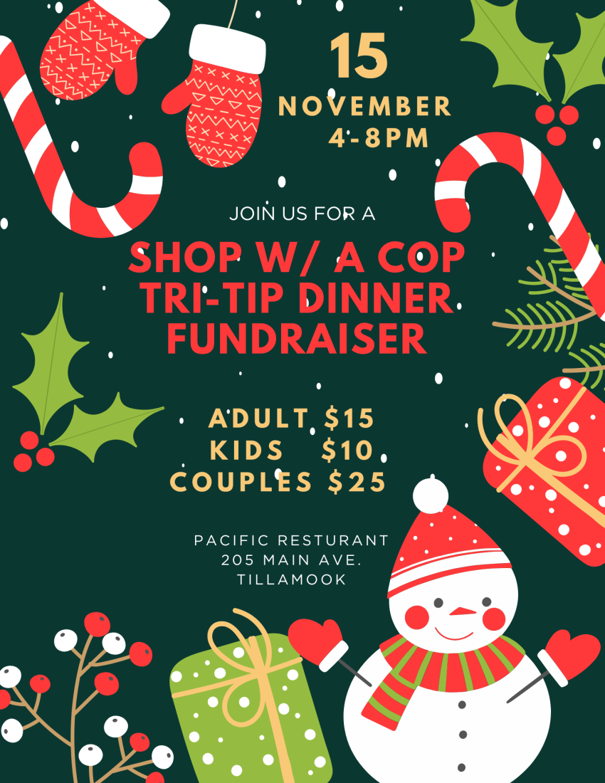 On Saturday, November 15th, from 4:00 p.m. to 8:00 p.m., the Pacific Restaurant will host a Tri-Tip Dinner Fundraiser and Celebration to mark the 21st anniversary of Tillamook County’s Shop with a Cop program.