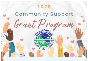 The Tillamook PUD Community Support Grant Program was developed in 2003 to assist local not-for-profit organizations in funding projects that promote economic growth and enhance community livability in Tillamook County. The Board of Directors budgets funds for the program annually; the amount budgeted for the program in 2026 was $100,000.