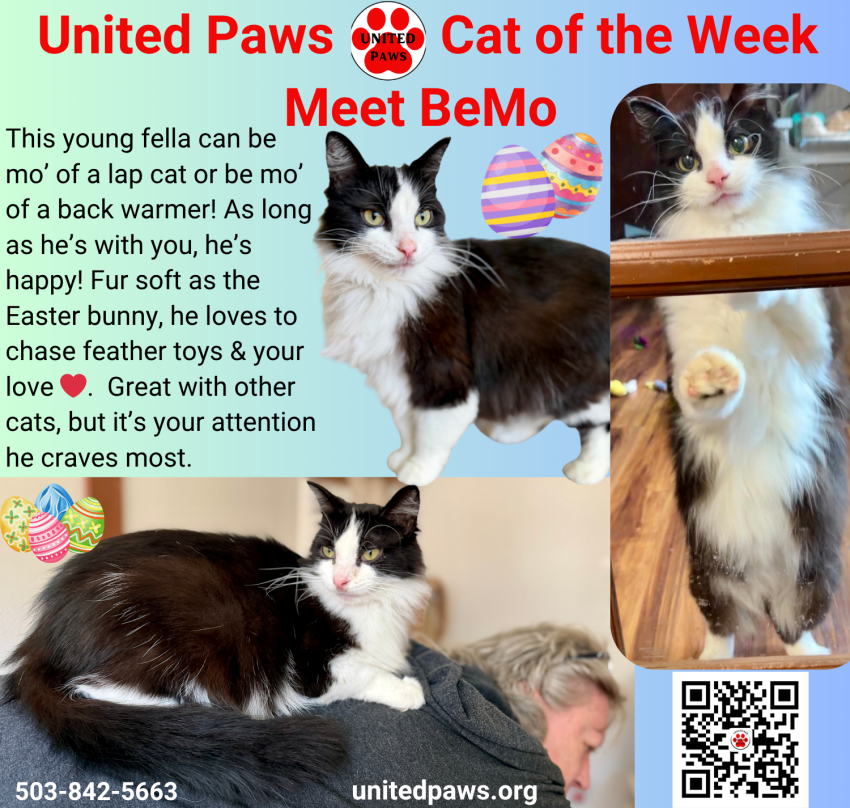 A volunteer with United Paws found BeMo wandering alone and afraid in a remote part of Tillamook County. He was in bad shape and it appeared he was abandoned. Once BeMo received some loving care, good food, and a warm bed, he began to relax. It did not take long for BeMo’s true affectionate and playful nature to shine. And boy, does he shine! When he is not clamoring for chin scratches and back rubs, he loves to chase and bat around toys of every kind. He is fascinated by feathers – especially if they are attached to a wand toy. BeMo loves to climb and perch up high where he can often be found taking a nap in a sunny spot.