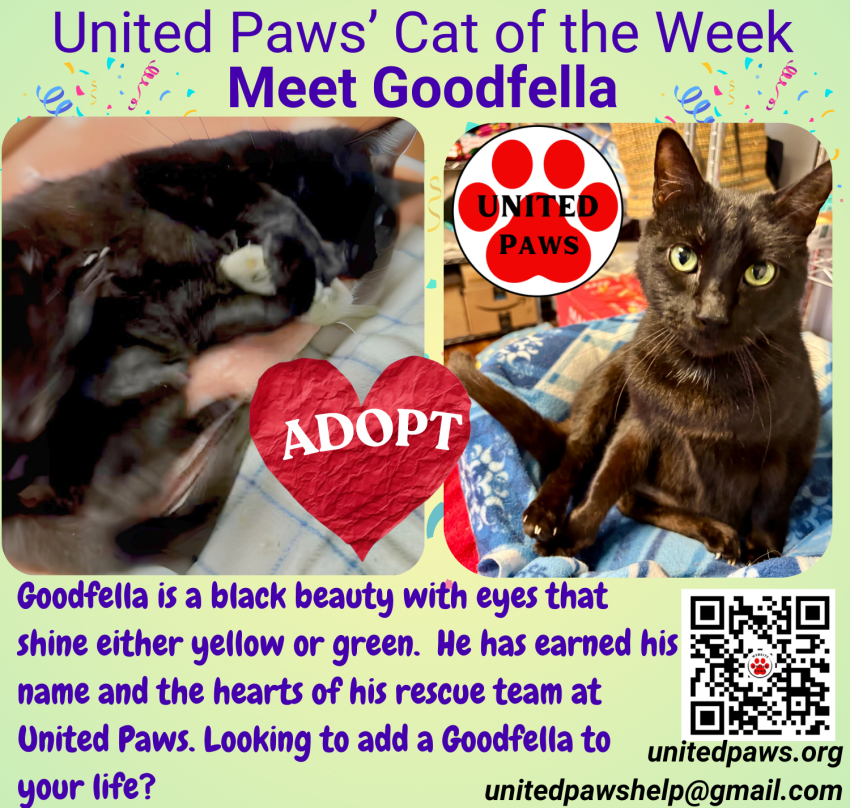 Introducing Goodfella, United Paws Cat of the Week. You don’t get the name “Goodfella” unless you are, well, a good fella. This black beauty with eyes that shine either yellow or green, has earned his name and the hearts of his rescue team at United Paws.
