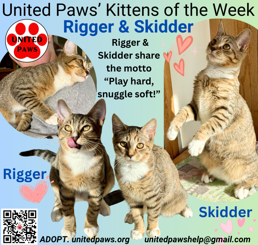 Meet Rigger & Skidder, United Paws Kittens of the Week. Not long ago these two were rescued by a dedicated UP foster who provided enough love, and food, to help them transform from tiny fragile kittens into magnificent, healthy companions.