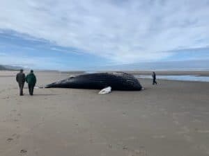 The whale washed ashore near a snowy plover management area. Oregon’s beaches are protected nesting grounds for a small shorebird called the western snowy plover. This means there is no access to the beach from the dry sand area where signs are posted and pets are not allowed. Watch for special signs or fences during nesting season (March 15 – Sept. 15) and follow the rules to help protect snowy plovers.