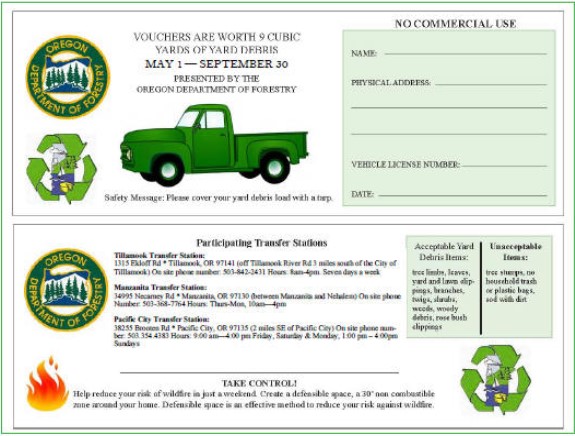 The ODF Yard Debris Voucher program enables residents to dispose of brush and branches at no cost at each Tillamook County Transfer Station: Manzanita, Tillamook, and Pacific City.